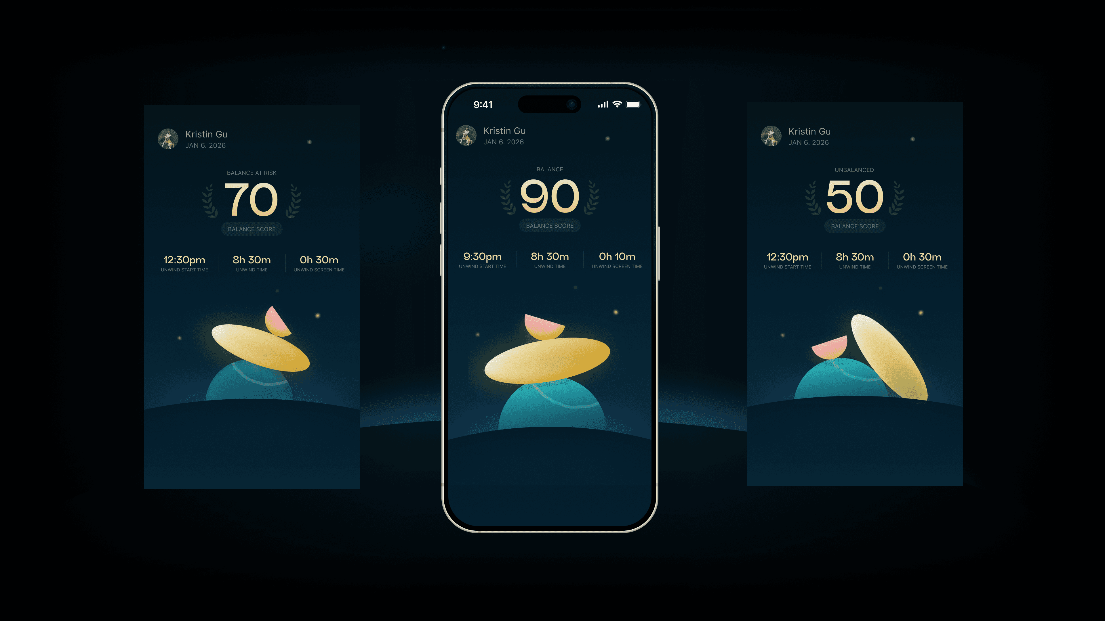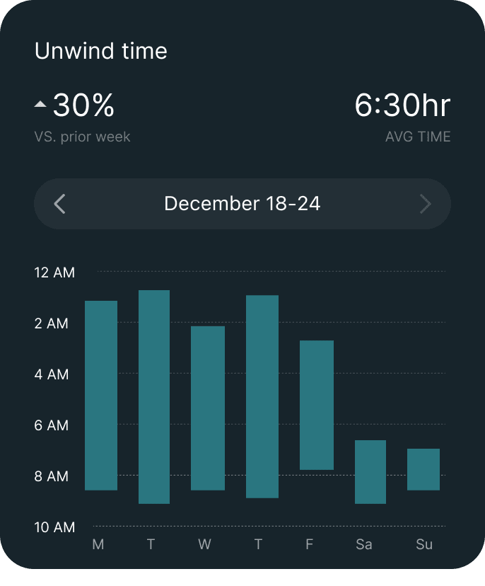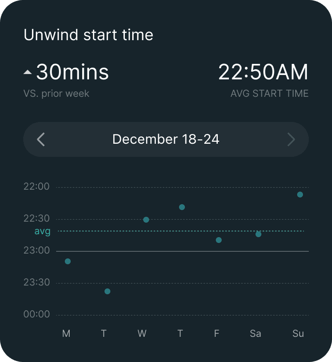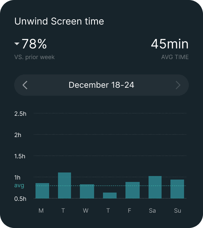 Each night, your balance score reflects your Unwind start time, duration, and screen use. Over time, these patterns become insights you can revisit and learn from.